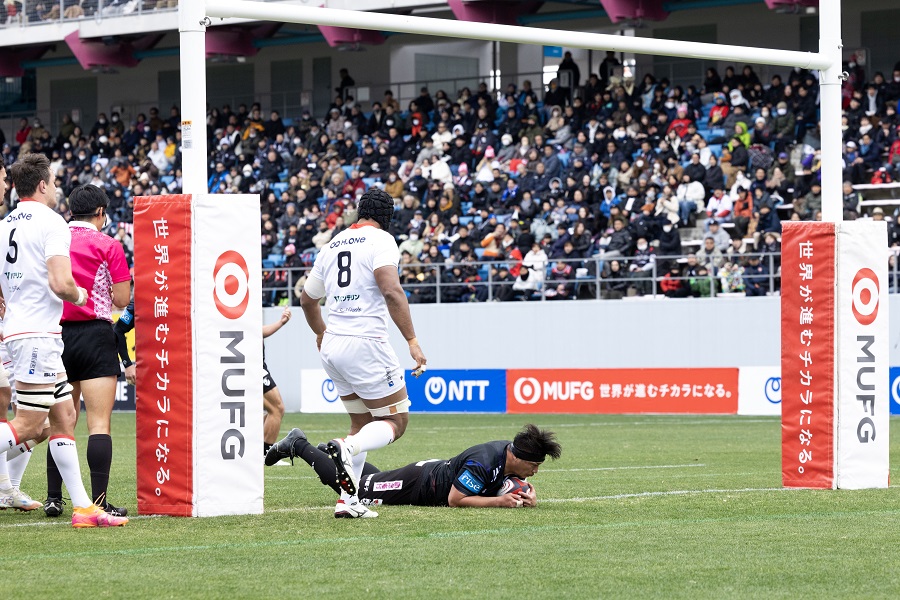 さらに後半5分には、SO中楠一期が自陣から仕掛けると、わずかにできたギャップを再びFBルーカスが突いてブレイク。NO8ワカヴァカ、CTB池田悠希と繋ぎトライを奪い17-14と逆転する。