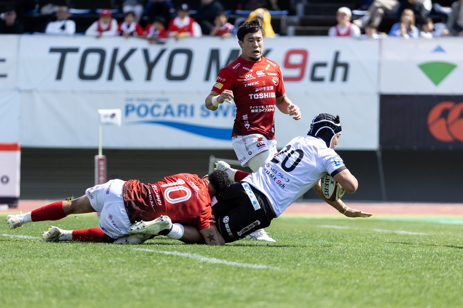 ラスト15分も運動量は落ちず、BR東京はハーフウェイ付近での安定したディフェンスをベースに、チャンスをうかがうかたちを継続する。後半32分にPGで加点。さらにホーン後、ボーナスポイントを目指しややバランスを欠いた状態でアタックを継続したBL東京の一瞬の隙を突き、WTB西川大輔がインターセプト。トライを奪って試合を締めた。
