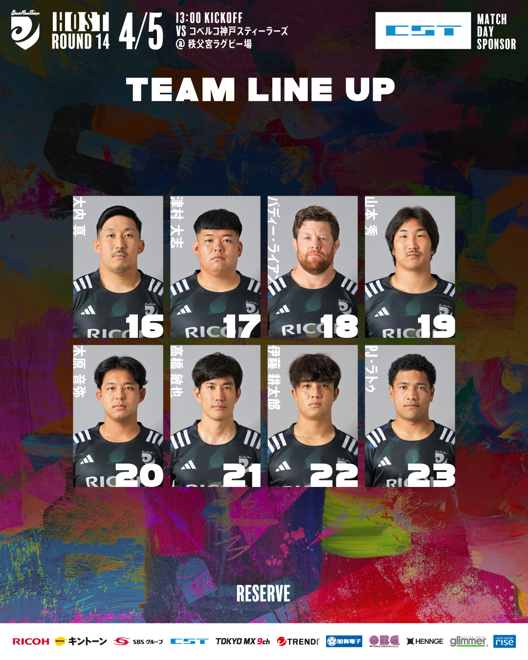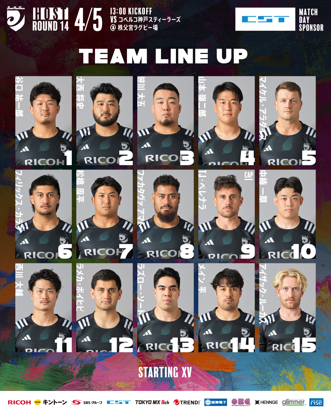 2026年4月5日(日)におこなわれるNTT JAPAN RUGBY LEAGUE ONE 2025-26 第14節 コベルコ神戸スティーラーズ戦について、以下のとおりメンバーを発表します。