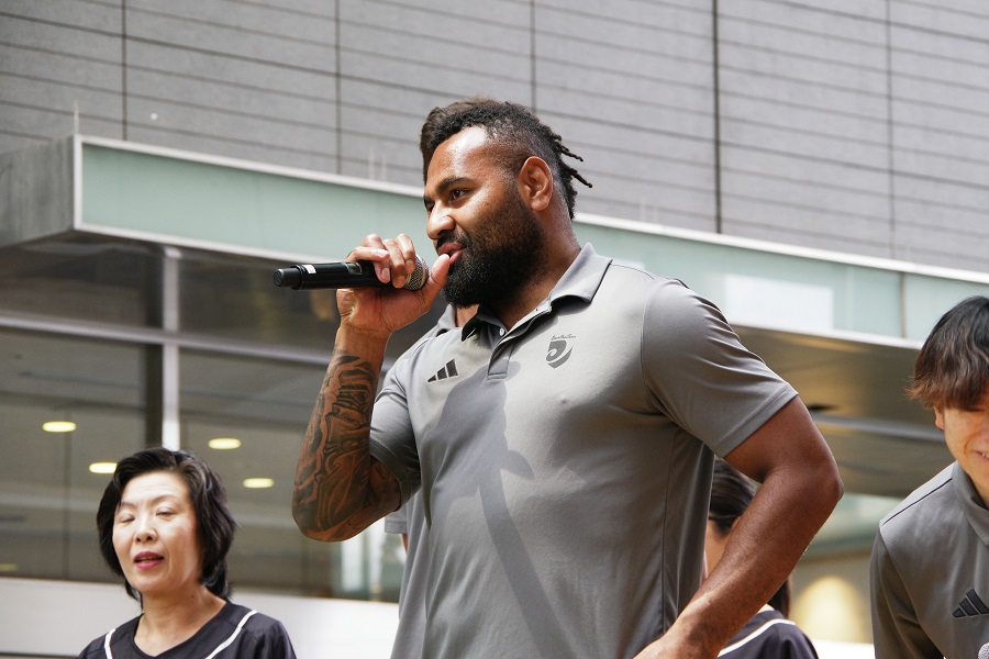 2024-25シーズン退団選手から、シオネ・アフェムイ選手、ルル・パエア選手、麻生典宏選手、ネイサン・ヒューズ選手、マイケル・ストーバーグ選手、ジェイコブ・スキーン選手、ネタニ・ヴァカヤリア選手、濱野大輔選手、ロトアヘア アマナキ大洋選手、山本昌太選手、柳川大樹選手が応援いただいた皆様へ挨拶をおこないました。