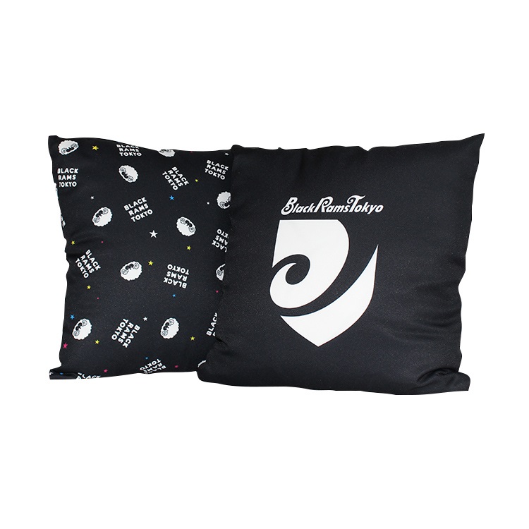ラムまるとBLACKRAMS TOKYOのふわっとした文字を総柄にした可愛らしいクッションをご用意。使いやすい40cm角のクッションです。シンプルなエンブレムバージョンと全2種類の展開です。