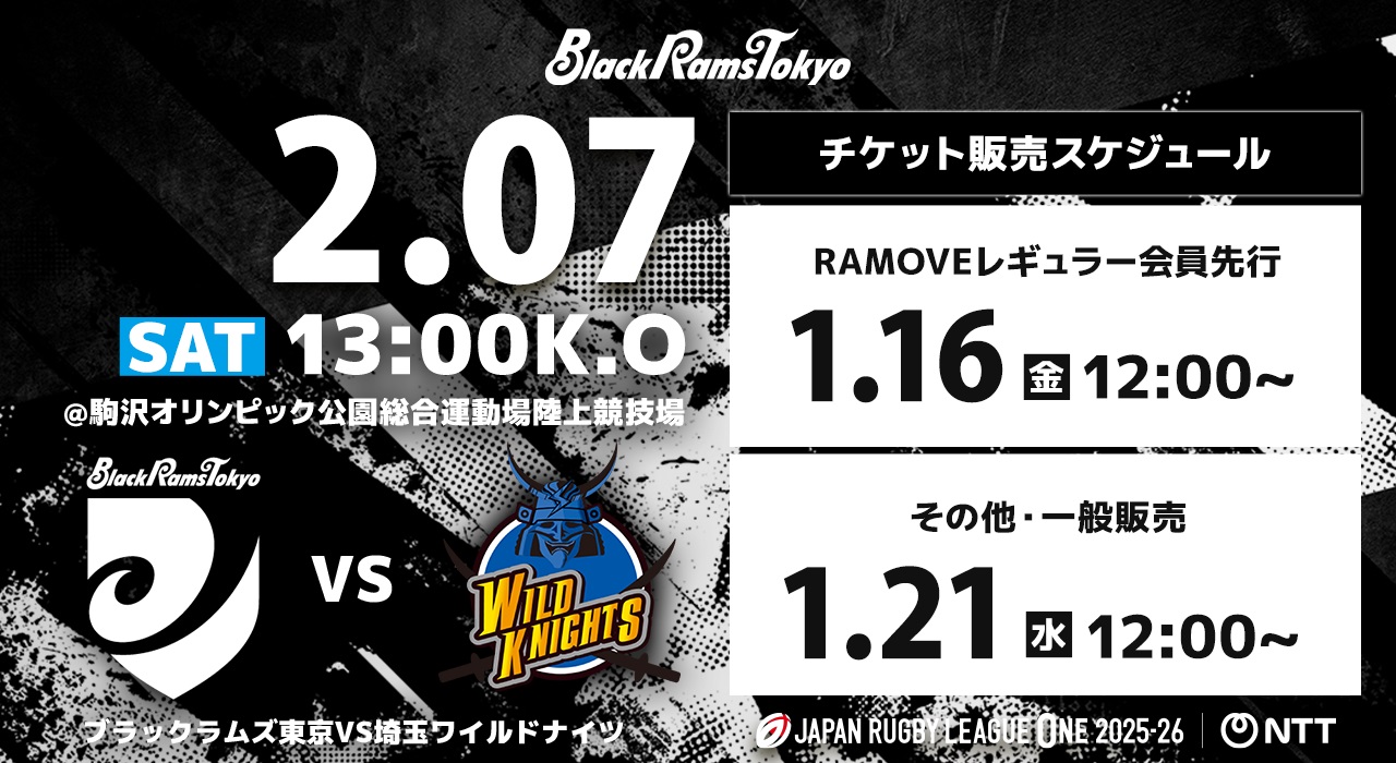 2026年2月7日(土) NTT JAPAN RUGBY LEAGUE ONE 2025-26 第7節 埼玉パナソニックワイルドナイツ戦について、以下のとおりチケットを販売いたします。当日はファンクラブ会員限定のイベントも実施します。