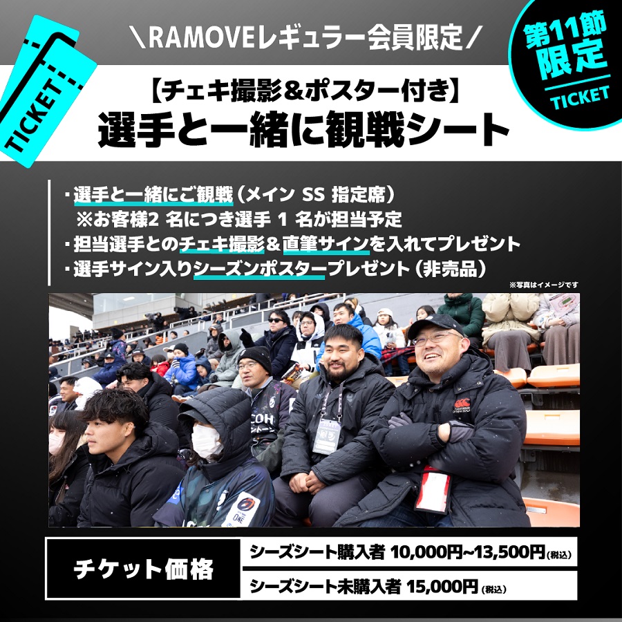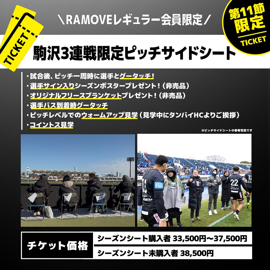 駒沢3連戦にて、誰よりもピッチに近く、選手たちと同じ目線で大迫力に試合を観戦できる「ピッチサイドシート」を RAMOVEレギュラー会員限定で10席 販売いたします。試合前には選手バス到着時のグータッチやウォームアップ見学、コイントス見学、試合後にはピッチを一周する選手たちとグータッチができる特別な観戦チケットです!さらに非売品の選手サイン入りシーズンポスターとフリースブランケットも特典としてプレゼントいたします。