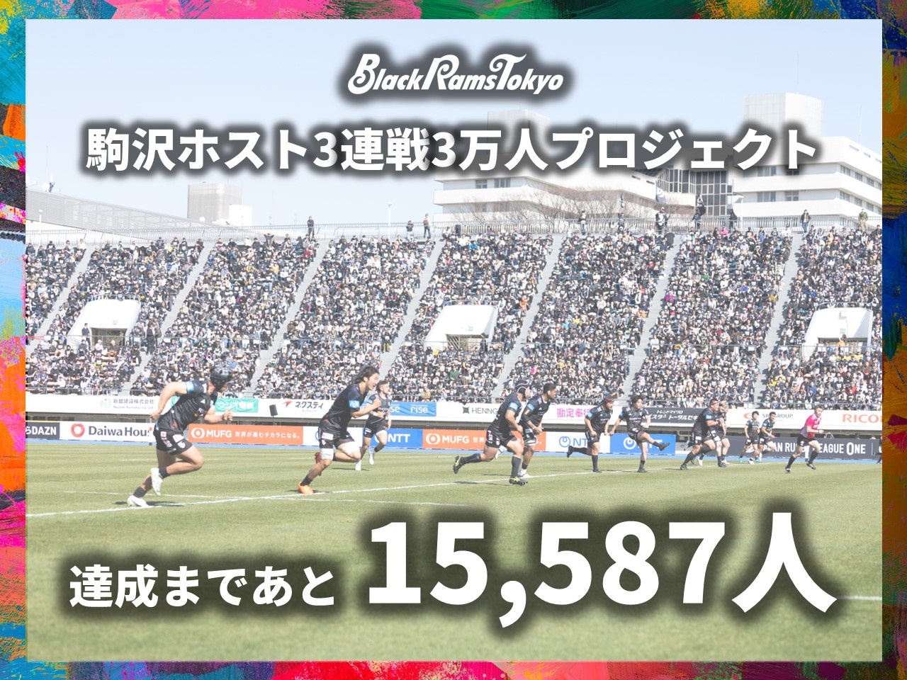 ブラックラムズ東京では、駒沢オリンピック公園総合運動場陸上競技場(以下、駒沢)で開催する第7節 埼玉パナソニックワイルドナイツ(以下、埼玉WK)戦、第9節 浦安D-Rocks(以下、浦安DR)戦、第11節 静岡ブルーレヴズ(以下、静岡BR) 戦を「駒沢ホスト3連戦3万人プロジェクト」として位置付けてきました。