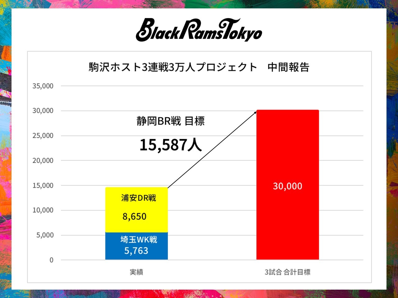 2試合を終えて合計来場者数は14,413人、3万人まであと15,587人となりました。最後の静岡BR戦に向けて、以下のとおり中間報告をさせていただきます。