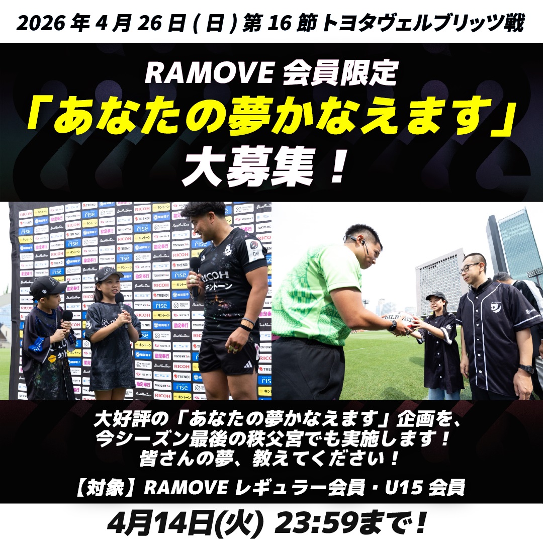 2026年4月26日(日)に秩父宮ラグビー場で開催される NTT JAPAN RUGBY LEAGUE ONE 2025-26 第16節 トヨタヴェルブリッツ戦にて、RAMOVE会員限定で「あなたの夢かなえます」企画を実施します。