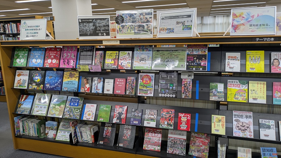 武井日向選手・栗原由太選手 おすすめ本の紹介、ラグビーに関する本の展示、ジャージー・ボール・スパイクの展示(状況によって変更になる可能性があります)