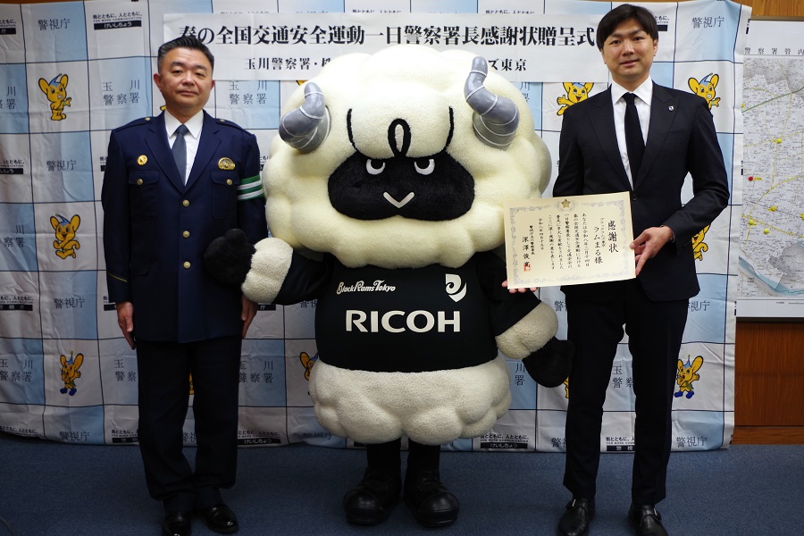 2026年3月14日(土)に駒沢オリンピック公園総合運動場陸上競技場で開催したリーグワン第11節 静岡ブルーレヴズ戦にて、ラムまるが玉川警察署の「一日警察署長」を務めました。本取り組みは、4月6日から15日まで実施された「春の全国交通安全運動」の事前PR活動の一環であり、当日はハーフタイムに交通安全運動パレードもおこないました。