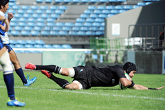 31分、リコーは再び敵陣に攻め込むと、中央ゴール前スクラムからボールを出し、走り込んだWTB星野将利につないで左中間にトライ(ゴール成功)。膝のケガから復帰した星野による2年ぶりのトライで19対7と点差を広げた。
