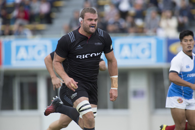 メンバーの入替は行わず後半へ。キックオフ直後、こぼれ球を拾ったFL武者大輔が前方へ、さらにSOエリソンから、ものすごいスピードで走り込んだLOモスタートへパス。モスタートが荒々しくディフェンスに挑んでいく。WTB松本悠介につなぐと粘って前進、右中間22m手前のポイントから展開。もう一度LOモスタートに渡しギャップを突くが惜しくもノックオン。(2分)