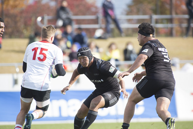 NO.8松橋がリスタート。真っ直ぐ左サイドを前進。ポイントをつくると右へ展開。CTBアマナキがタッチライン際をゲイン。22mラインの内側へ侵入する。左に折り返すと中央のラックでトヨタ自動車にノットロールアウェイ。リコーはPGを狙い成功。9−15と1トライ1ゴールで届く点差へと迫った。(22分)