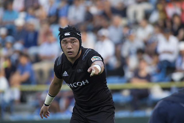 リコーはその位置から再開。他のFWと肩を組んだPR柴田がボールを持ってディフェンスラインに突っ込んでいく。左へ振ると短いパスをつないでギャップを探っていく。CTB松本、LOブロードハースト、FBロビンソンらがわずかなスペースを鋭く突いて身体をねじ込んでいく。粘り強くフェイズを重ねると、左中間でSO木上からのオフロードパスを受けたCTB濱野が左中間を突く。タックルで倒されかけるが、体勢を戻して前へ。ついにインゴールに抜け中央にトライ。リコーが意地のトライを返す。CVも濱野が自ら決めて12−35。(後半38分)