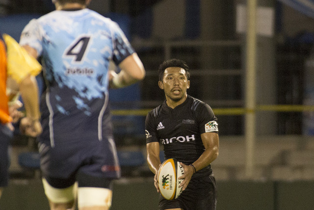 まずは先にスコアして点差を詰めたいリコー。深く蹴り込まれたキックをキャッチし自陣から回していくと、ヤマハ発動機は猛然とプレッシャーをかけてくる。それでもリコーは少し前に出してSH中村正がキック。