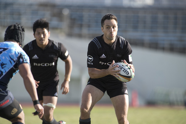 左サイドをWTBロトアヘアアマナキ大洋がゲイン。フェイズを重ね逆サイドまで運ぶと、今度はFLエリオット ディクソンが豪快なキャリーで前に出る。一旦内に戻しラックにした後、再び右サイドを突いたのはCTB濱野大輔。タックルを受けながらも身体を低く伸ばしインゴールへボールを届かせてトライ。CVも決まり10-0。リコーが試合の入りを制した。(前半6分)