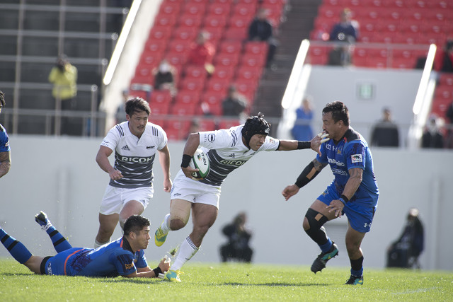 不意を突かれ勝ち越しを許したリコーだったが、食らいついていく。左中間に飛んだキックオフボールの落下地点にいち早く詰めたCTB牧田旦が後方にボールをはたくと、ダイレクトでFLエリオット ディクソンがキャッチ。一気に右サイドに展開するとCTB濱野大輔、PR眞壁貴男がディフェンスの間に身体をねじ込んでゲインしていく。折り返すと今度はCTB牧田、HO芳野らが思い切りのよいキャリーを見せる。22mラインが迫ると、パナソニックにオフサイド。アドバンテージが出た状況で攻め続けたリコーは、右中間からSOロビー ロビンソンが中央へキックを上げる。