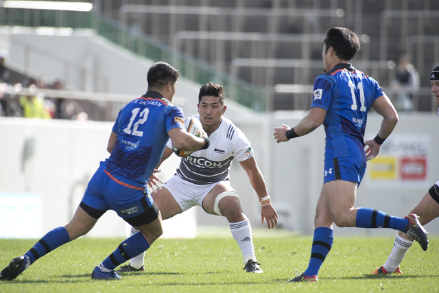 リコーはスクラムでややプレッシャーを受け、パナソニックはハンドリングエラーが目立つといった問題を抱えながらも、互いにディフェンスの精度を保った締まった展開が続く。