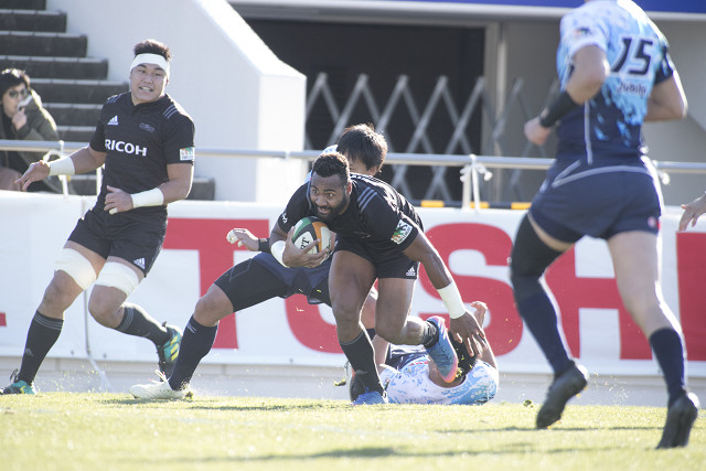 リコーは左サイドから右サイドへ確実にボールをつなぐ。外に一人残した状態で仕掛けたWTBヴァカヤリアが加速するとタックルを巧みに外してインゴールへ持ち込み、この日2つ目のトライを挙げた。CVは外れたが31-5とさらにリコーが点差を広げる。