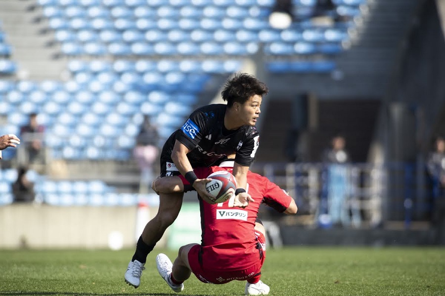 後半は入りの時間帯に左サイドでキャリーを繰り返されてゲインを許し、4分にトライを奪われる。主導権を取り戻せないまま、20分にはPGで失点し17-31。だがBR東京は、リスタートキックの蹴り返しを使ってハーフウェイ付近からアタックを仕掛けると、テンポを上げ相手を左右に振って前進。左サイドのスペースを見つけたSH山本のキックパスがWTBヴァカヤリアに通り左隅にトライ(22分)。さらに自陣の密集からのピックゴーで前方のギャップを抜けたLOマイケル ストーバーグが、ビッグゲインに成功し敵陣中盤へ。今度はSOアイザック ルーカスがキックパスを放ち、左サイドのWTBヴァカヤリアから細かくつないでディフェンスを振り切り、CTB礒田凌平が公式戦初トライ(24分)。連続ポイントで29-31と詰め寄る。