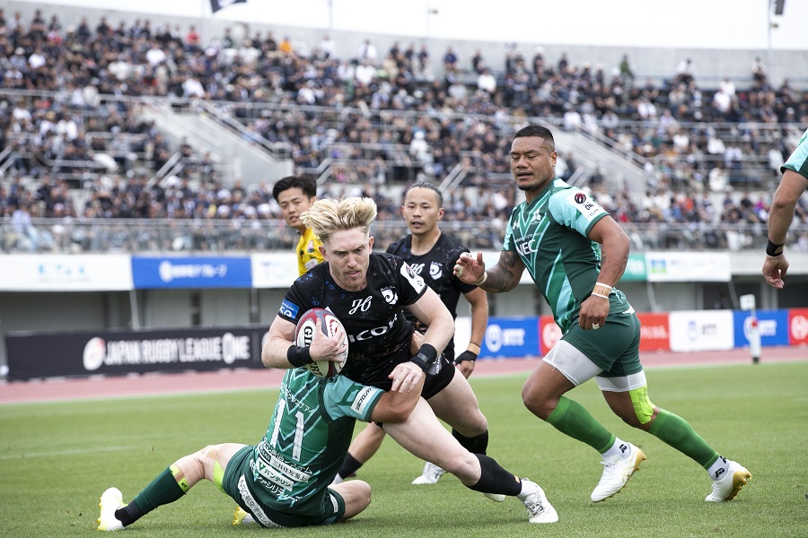 気を引き締め直したBR東京は、LOマイケル ストーバーグのブレイクで敵陣に入るも反則で後退。しかしFBルーカスが自陣からのランでディフェンスを切り裂き、敵陣深くまで再度ゲイン。右のタッチライン際を走ったFLアマト ファカタヴァにつなぎ、右隅にトライ(15分)。ようやく後半最初のスコアが入る。