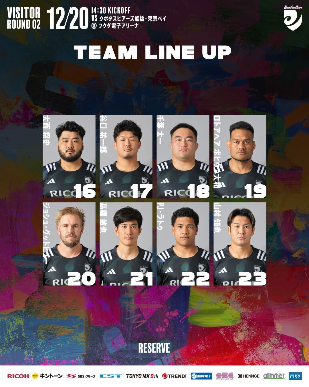 2025年12月20日(土)におこなわれるNTT JAPAN RUGBY LEAGUE ONE 2025-26 第2節 クボタスピアーズ船橋・東京ベイ戦について、以下のとおりメンバーを発表します。