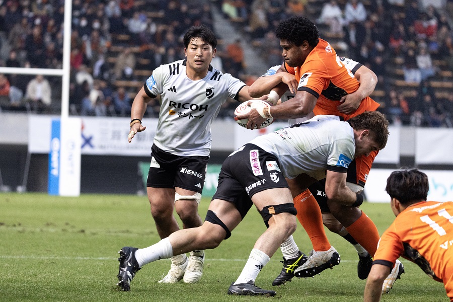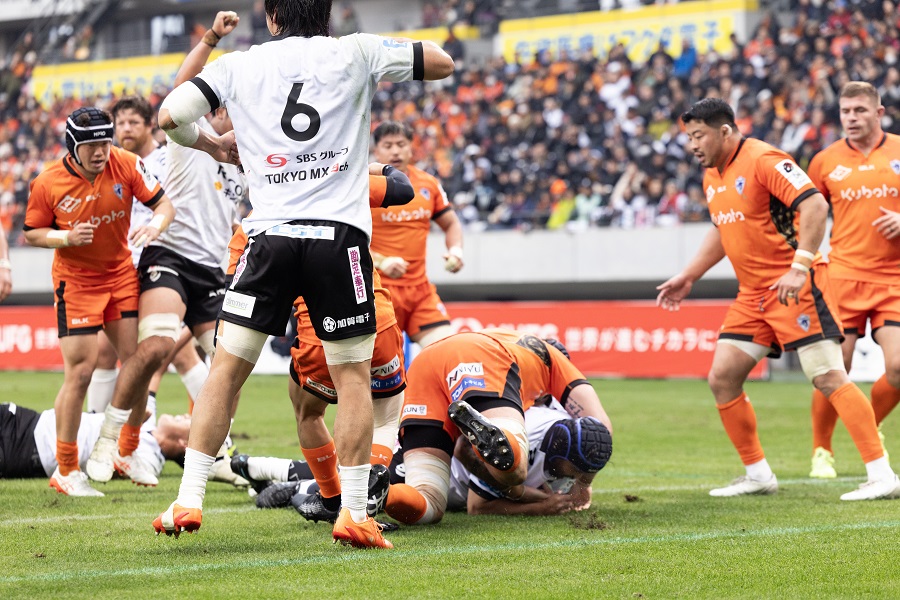 後半8分、S東京ベイにイエローカードが出て数的優位に立つ。PGを1本返されたが、15分にスクラムに押し勝つとゴール前ラインアウトからモールを組む。このチャンスで、一度こぼれかけたボールを手中に収めたHO大西将史が、左中間トライゾーンに持ち込みトライ。25-29とする。