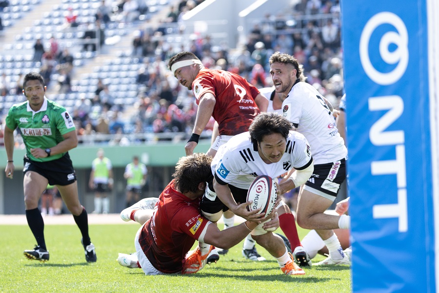 ラスト15分も運動量は落ちず、BR東京はハーフウェイ付近での安定したディフェンスをベースに、チャンスをうかがうかたちを継続する。後半32分にPGで加点。さらにホーン後、ボーナスポイントを目指しややバランスを欠いた状態でアタックを継続したBL東京の一瞬の隙を突き、WTB西川大輔がインターセプト。トライを奪って試合を締めた。