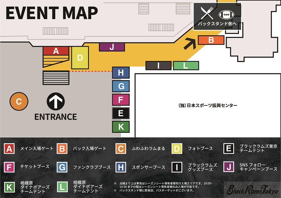 ・シーズンシートをお持ちの方は、10:00より先行入場が可能です。先行入場可能エリアは、マップ赤線より奥(黄色エリア)になります。