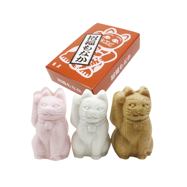 招き猫の発祥として有名な豪徳寺にちなみ、一口サイズで招き猫を表現した「招福もなか」。こしあん、白あん、つぶあんの3種類が、それぞれ白、ピンク、茶の招き猫をかたどっています。