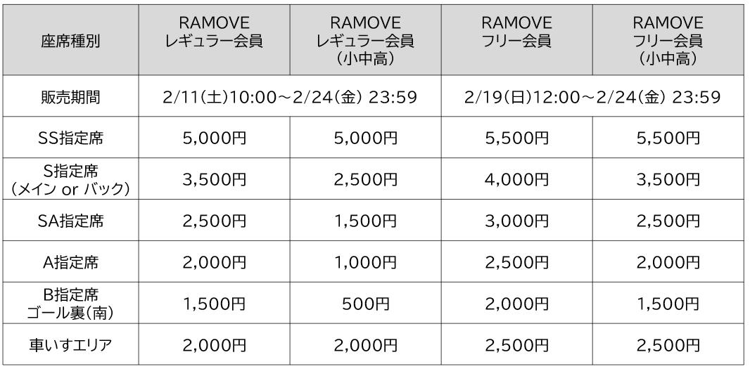RAMOVEレギュラー会員・フリー会員それぞれの発売日から一般発売日前日まで、通常の会員価格から500円引きの特別価格にてチケット販売いたします。平日ナイターの試合を少しお得に観戦できるチケットとなります。ぜひお早目のご購入をご検討ください。