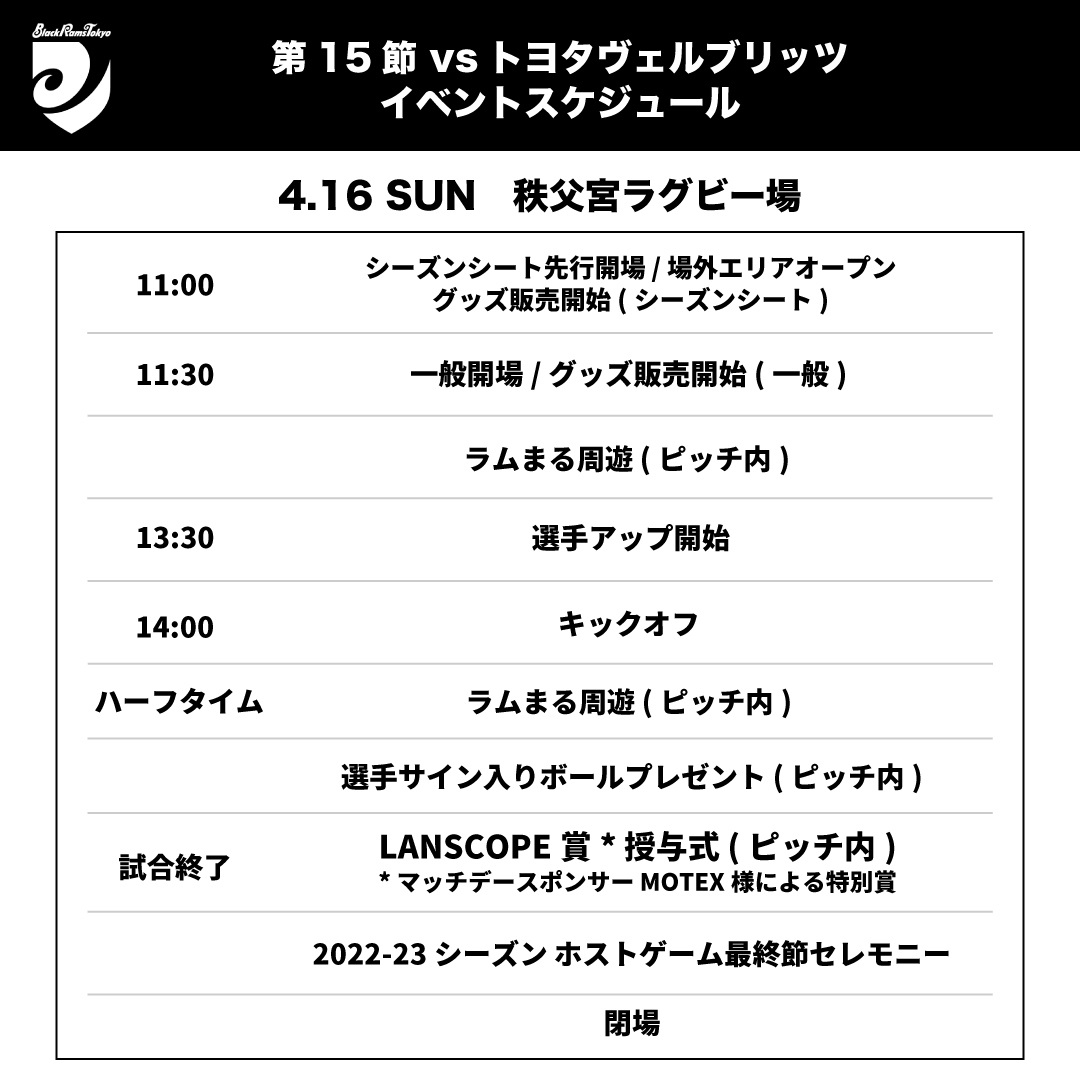4月16日(日) NTT JAPAN RUGBY LEAGUE ONE 2022-23 第15節 トヨタヴェルブリッツ戦の特設サイト及びイベント情報をお知らせ致します。2022-23シーズン最後のホストゲームとなるこの日は、今シーズン応援いただいたラムズファミリーの皆様とともに「秩父宮真黒計画」を実現し、秩父宮ラグビー場を黒く染めることを目指しています。最後まで熱い応援よろしくお願いします。