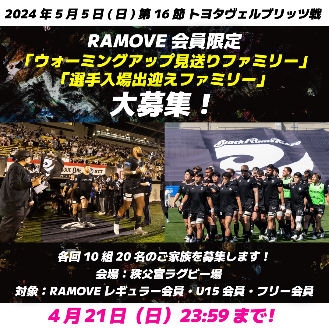 2024年5月5日(日)に秩父宮ラグビー場で開催される NTT JAPAN RUGBY LEAGUE ONE 2023-24 第16節 トヨタヴェルブリッツ戦にて、RAMOVE会員限定で「ウォーミングアップ見送りファミリー」「選手入場出迎えファミリー」を募集します。今回は親子などご家族でのご参加が可能です。