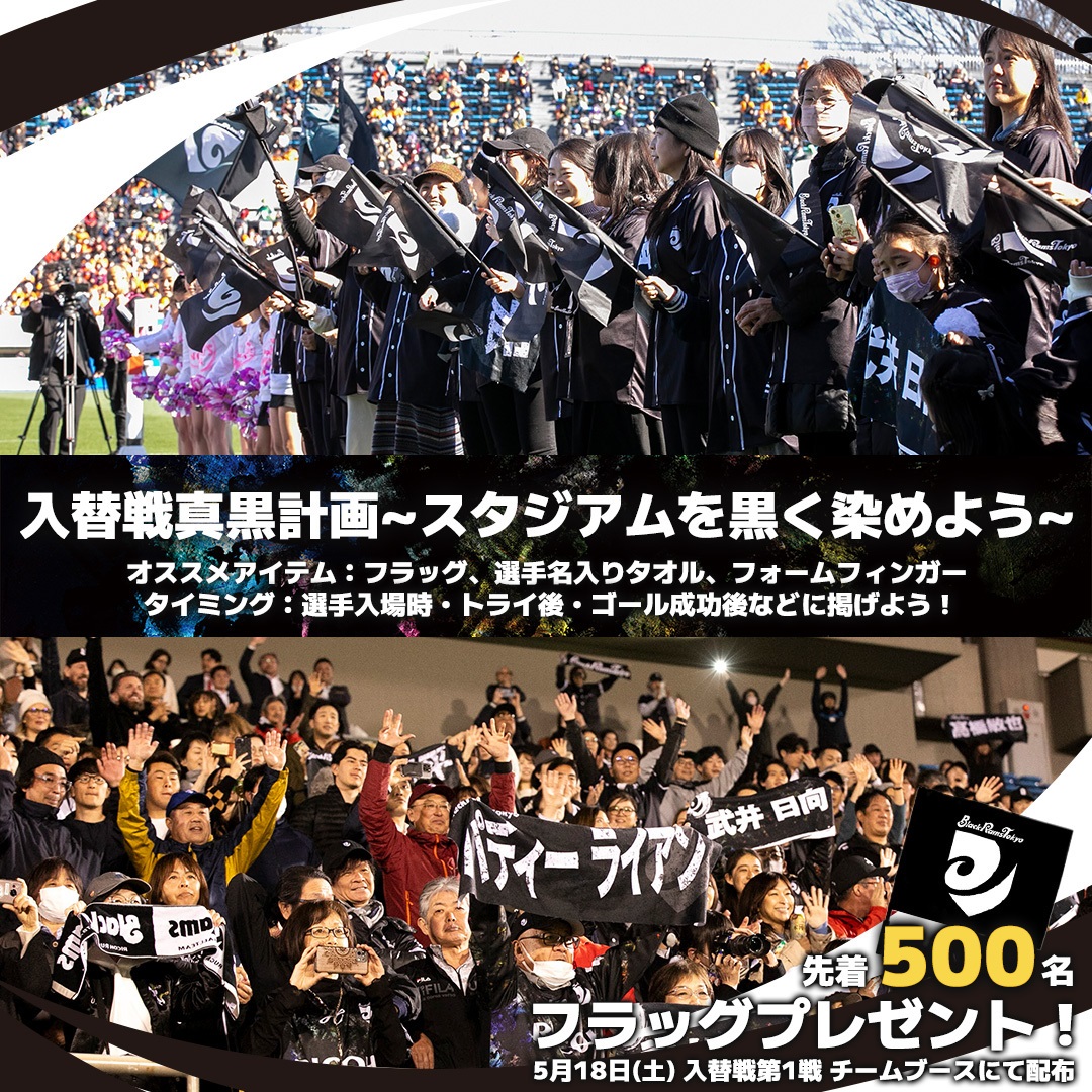 2024年5月18日(土) NTT JAPAN RUGBY LEAGUE ONE 2023-24 D1/D2入替戦第1戦 NECグリーンロケッツ東葛戦にて、「入替戦真黒計画」と題してフラッグプレゼントを実施します。