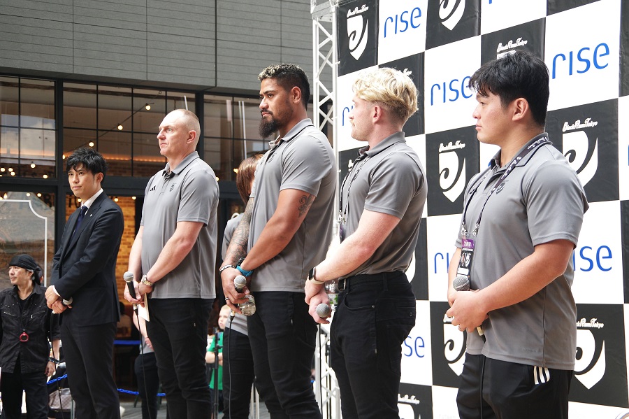 2023-24シーズン退団選手から、SH中村正寿選手(在籍13シーズン)、PR眞壁貴男選手(在籍9シーズン)、HO小池一宏選手(在籍9シーズン)、FB中澤健宏選手(在籍8シーズン)、マット・マッガーン選手(在籍5シーズン)が応援いただいた皆様へ挨拶をおこないました。