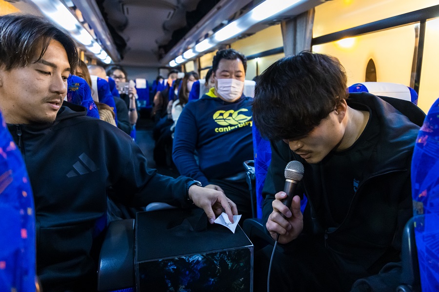 堀米航平選手と西川大輔選手、湯川純平選手と稲葉聖馬選手がそれぞれコンビを組んでバスに乗車し、試合当日7:00に東京駅を出発。車内では、質問コーナーやビンゴ大会で盛り上がりました。