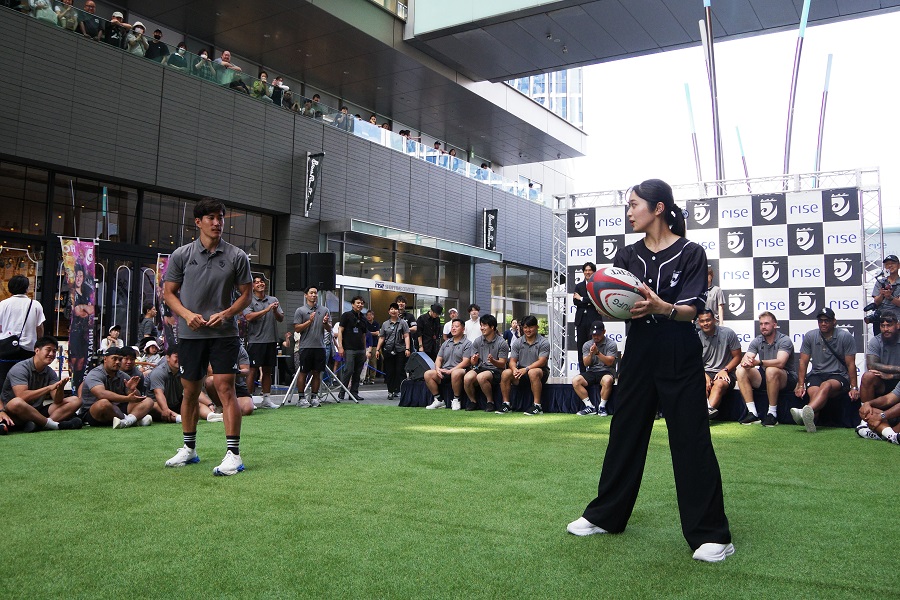 シーズン報告会終了後はデモンストレーションを実施。スクラム・ラインアウト・パスを選手が実演し、観覧者を代表して浅野杏奈さんにも体験いただきました。初めてラグビー見る方にもその迫力や難しさが伝わり、会場は歓声に包まれました。