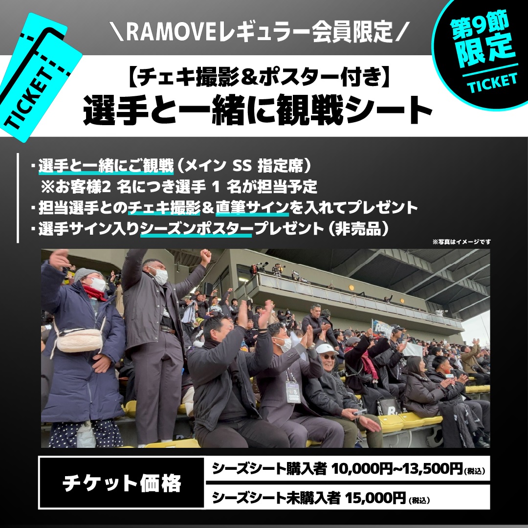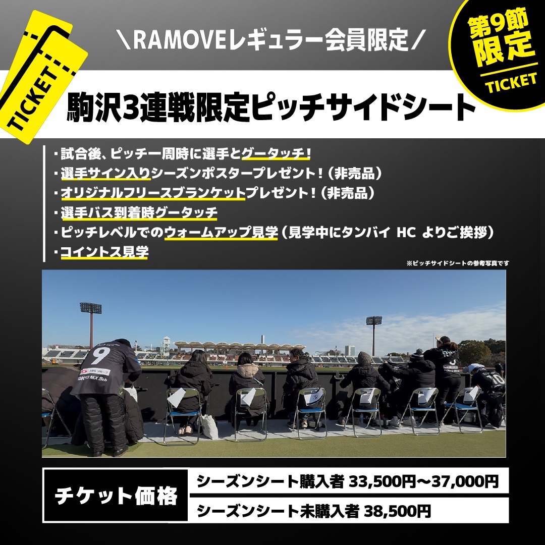 駒沢3連戦にて、誰よりもピッチに近く、選手たちと同じ目線で大迫力に試合を観戦できる「ピッチサイドシート」を RAMOVEレギュラー会員限定で10席 販売いたします。試合前には選手バス到着時のグータッチやウォームアップ見学、試合後にはピッチを一周する選手たちとグータッチができる特別な観戦チケットです!さらに非売品の選手サイン入りシーズンポスターとフリースブランケットも特典としてプレゼントいたします。
