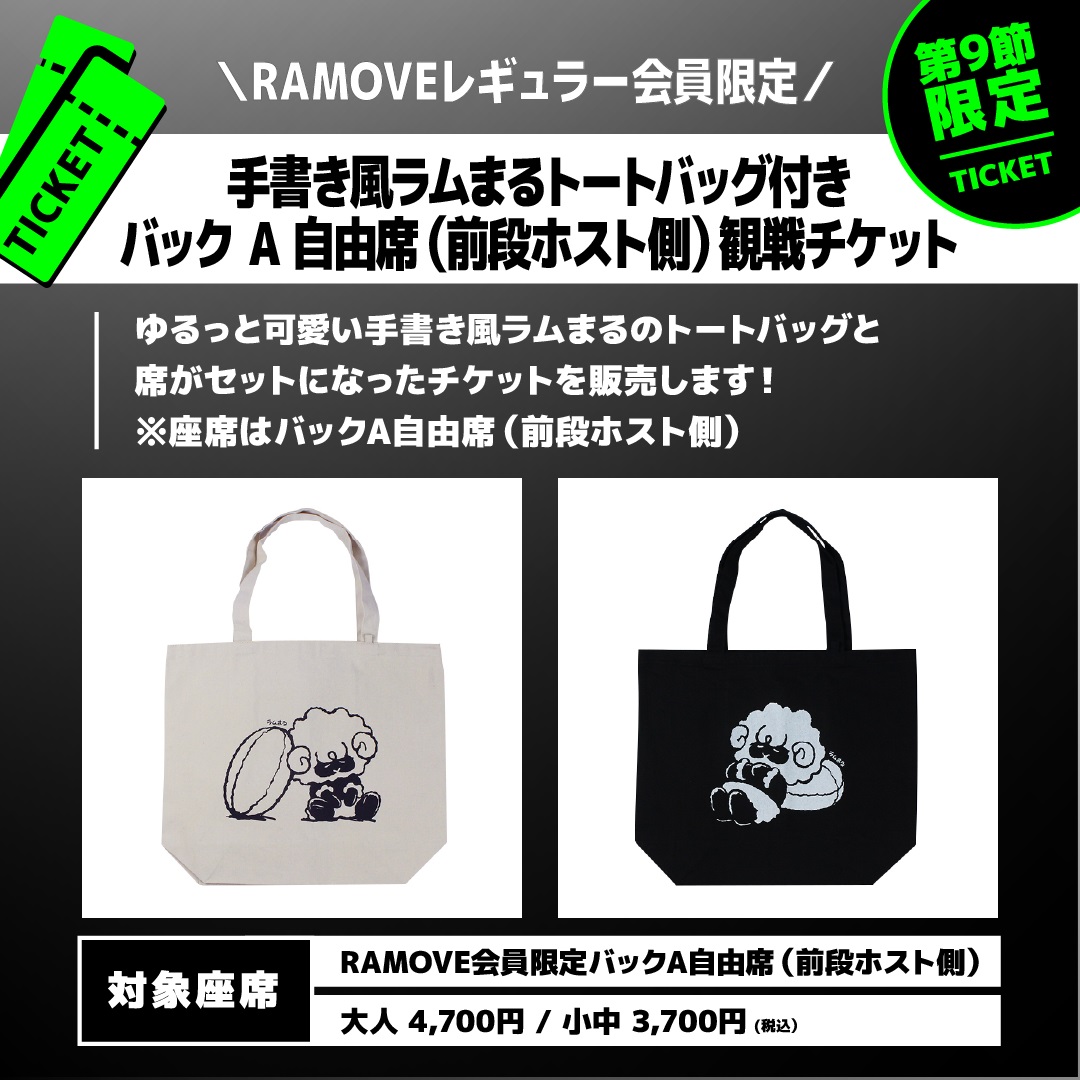 大好評の手書き風ラムまるシリーズに新デザインのトートバッグと席がセットになったチケットを販売します!観戦にもお買い物にも便利なタフな相棒になること間違いなしのこのバッグと、ブラックラムズを熱く応援しましょう!