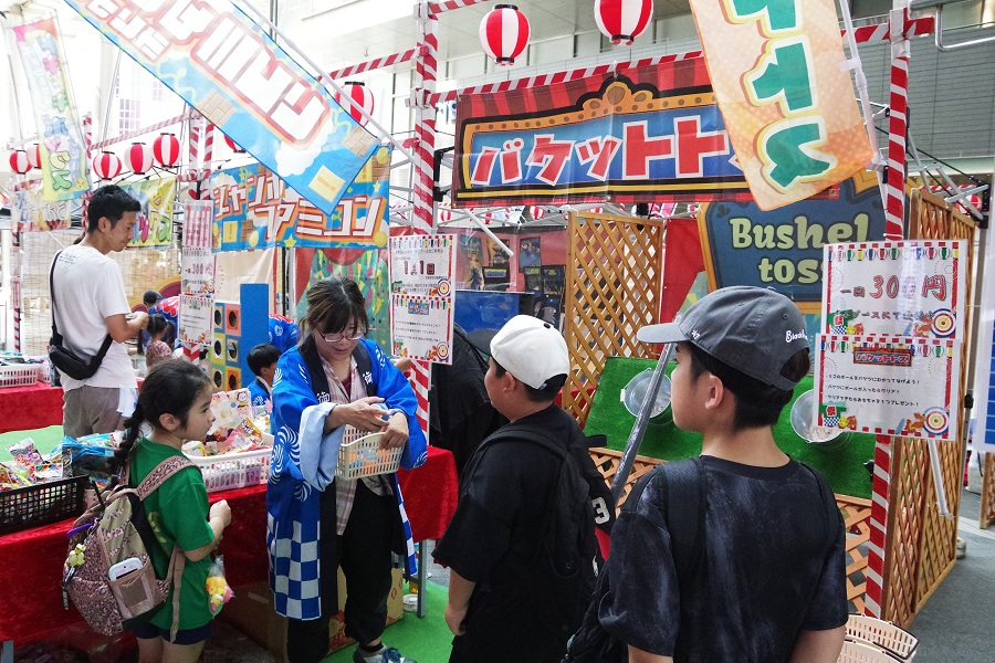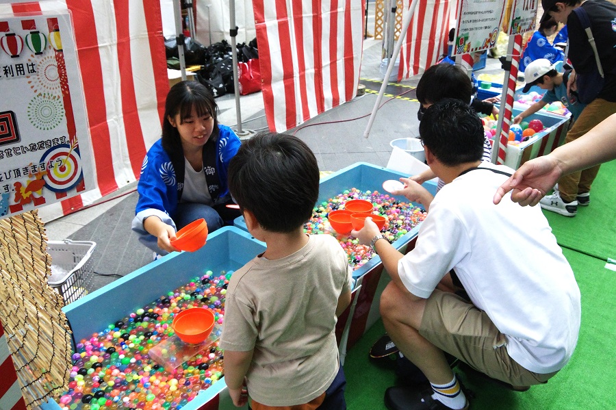 夏祭りの定番・縁日ブースでは、水ヨーヨーつり、スーパーボールすくい、キャラクター人形すくい、バスケットトス、水中コイン落とし、宝石発掘ゲーム、レトロTVゲーム、ドキドキBOXをお楽しみいただきました。