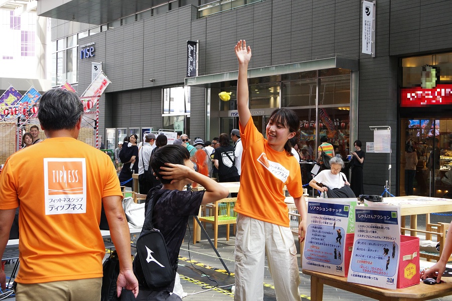ブースでは「子供体力測定会」を実施し、お子様に「ジャンプ力」「視覚反応力」「バランス力」などを測定に挑戦いただきました。人工芝エリアでは「簡単エクササイズ体験会」「親子ヨガ」「キッズヨガ」を開催し、参加者の皆さんは笑顔で楽しく汗を流していました。