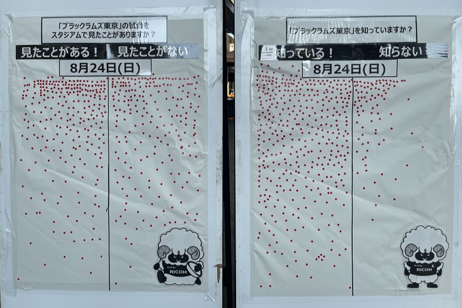昨年に続き、ボードを使った認知度調査を実施。二子玉川ライズ ガレリアを通行する方々に、「ブラックラムズ東京を知っていますか?」「スタジアムで試合を見たことがありますか?」の2つの質問に答えていただきました。結果は、2日間共通で「ブラックラムズ東京を知っている」が80%以上、「スタジアムを試合で見たことがある」が約50%ととなりました。