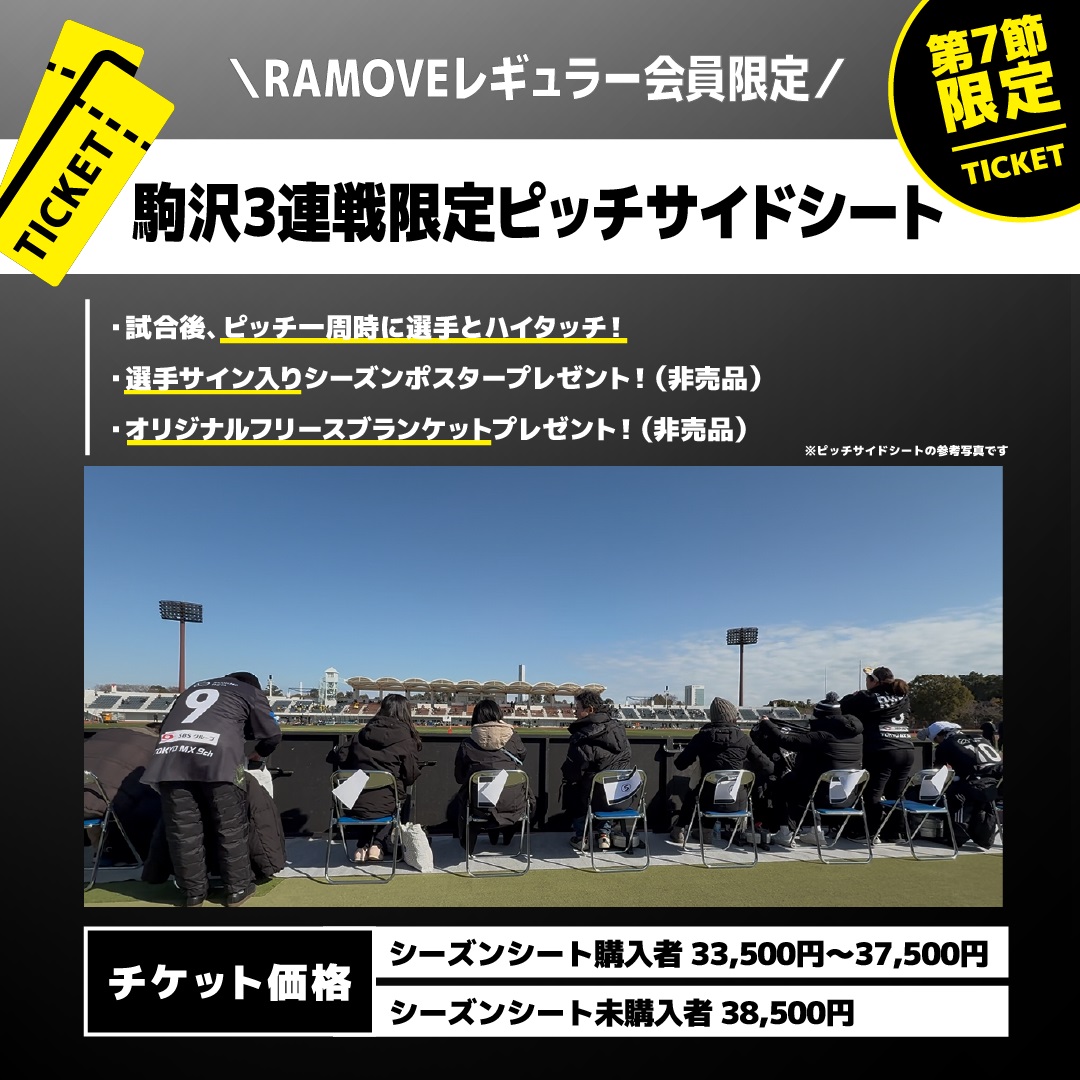 駒沢3連戦にて、誰よりもピッチに近く、選手たちと同じ目線で大迫力に試合を観戦できる「ピッチサイドシート」をRAMOVEレギュラー会員限定で10席販売いたします。試合後にはピッチを一周する選手たちとハイタッチ!さらに非売品の選手サイン入りシーズンポスターとフリースブランケットも特典としてプレゼントいたします。 誰よりも近くで選手たちの熱や汗や声を感じながら、飛んでくるボールには気を付けて、エキサイティングな体験をお楽しみください!