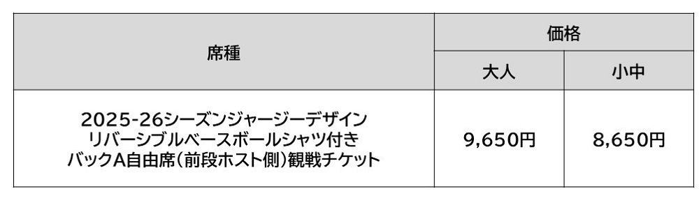 ③2025-26シーズンジャージーデザイン リバーシブルベースボールシャツ付きバックA自由席(前段ホスト側)観戦チケット