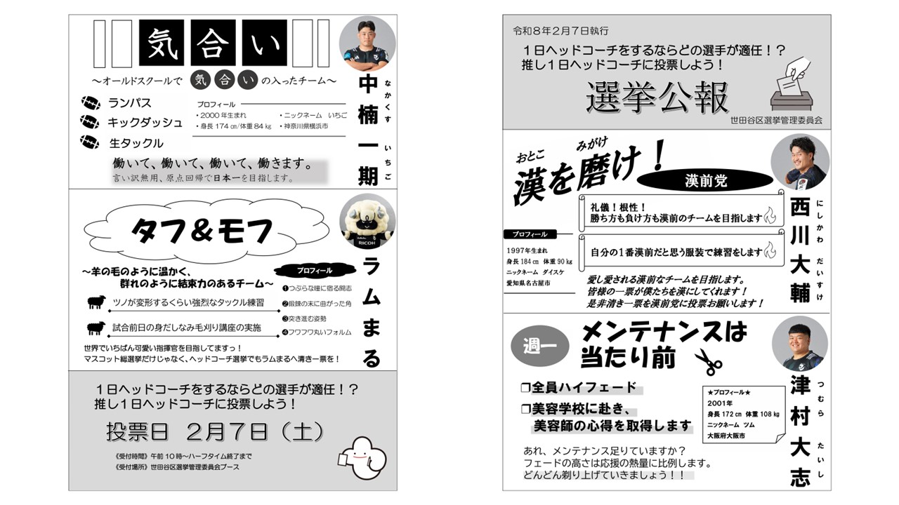 2026年2月7日(土) 埼玉パナソニックワイルドナイツ戦にて、世田谷区選挙管理委員会と連携し、ブラックラムズ東京選手を候補者に見立てた模擬選挙『トライ!投票体験コーナー』を実施します。