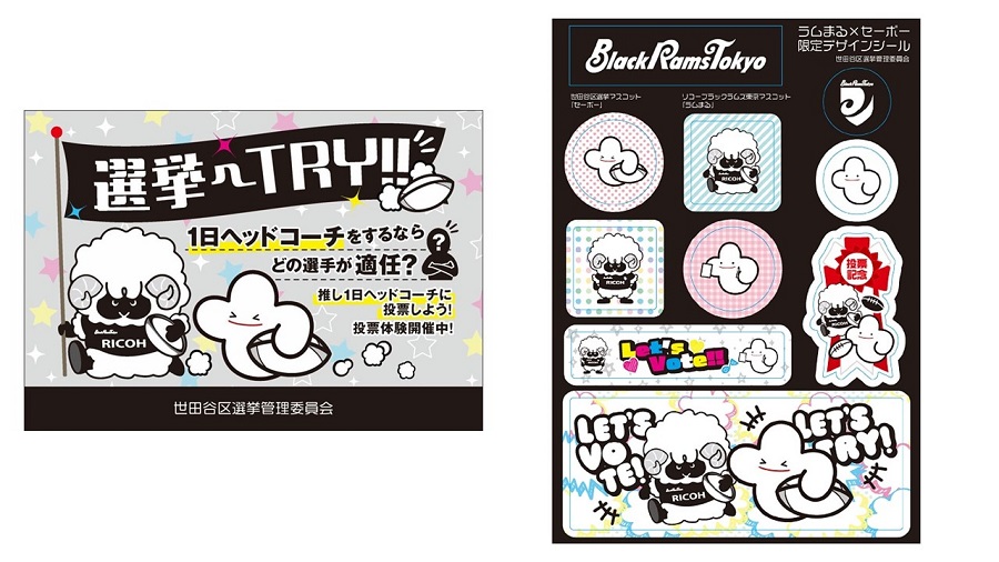 模擬投票に参加してくれた方には、ブラックラムズ東京オリジナルキャラクター『ラムまる』と世田谷区選挙マスコット『セーボー』のオリジナルシールをお渡しします。