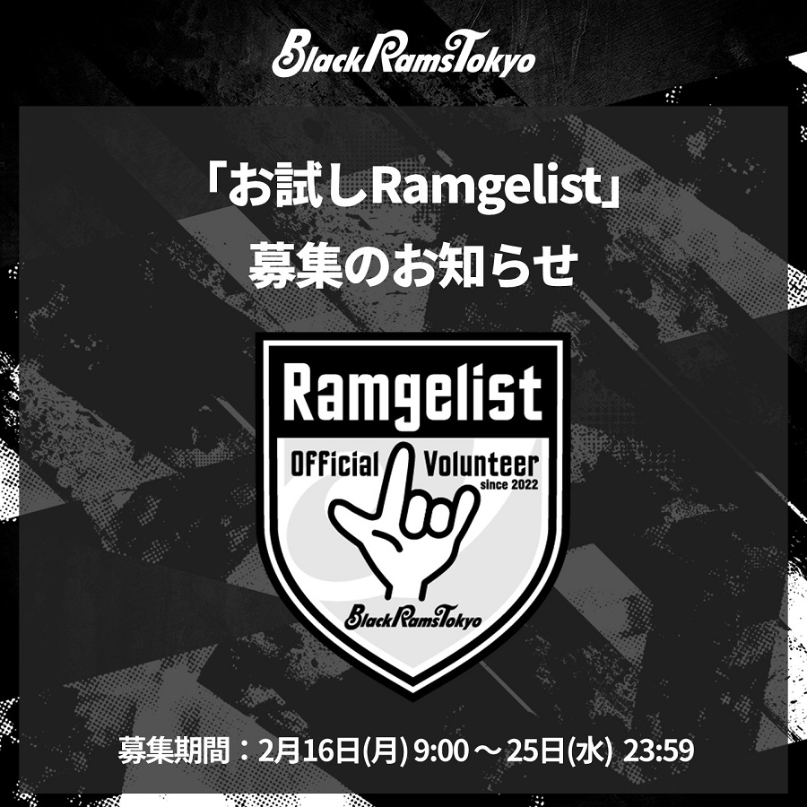ブラックラムズ東京では、公式ボランティア組織「Ramgelist(ラムジェリスト)」の活動をより多くの方に知っていただくため、ホストゲーム2試合を対象とした体験プログラム「お試しRamgelist」を実施いたします。