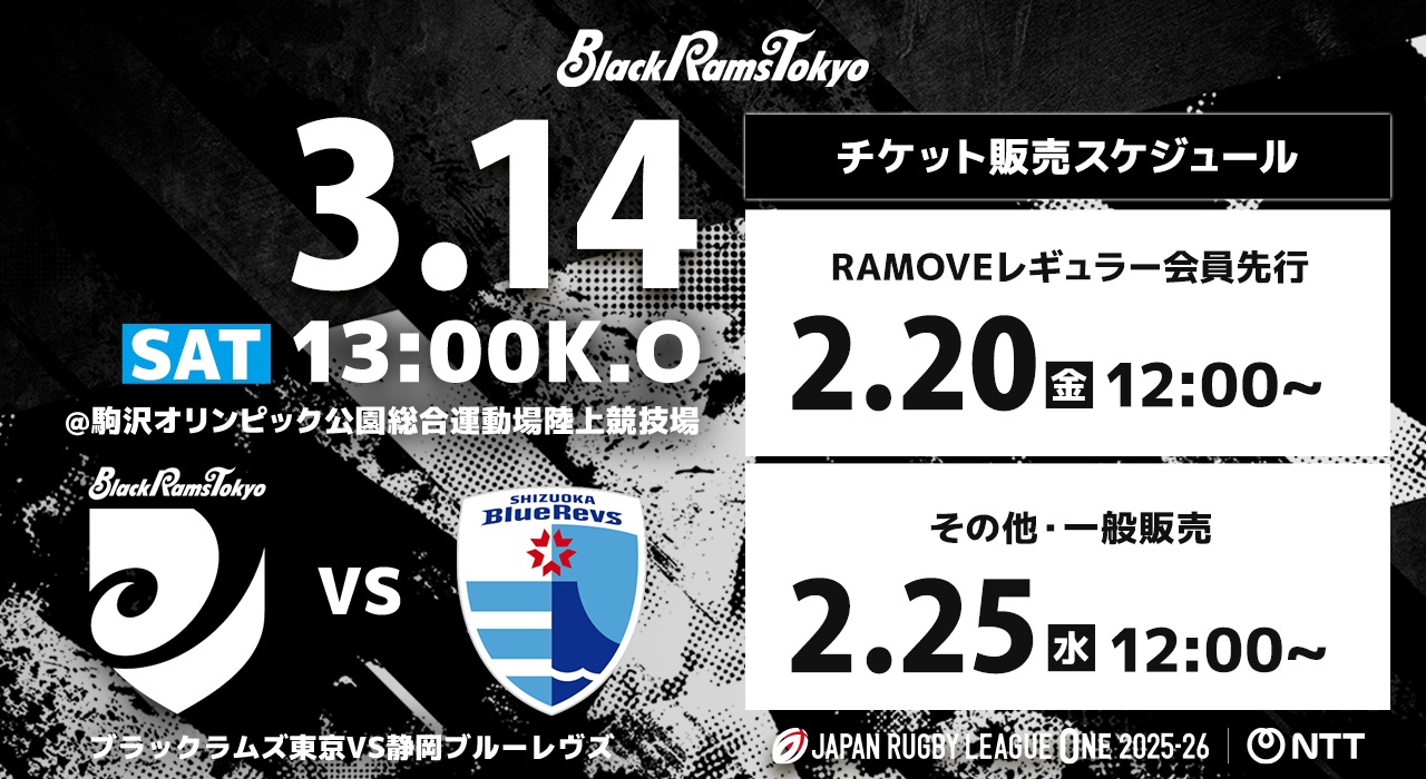 2026年3月14日(土) NTT JAPAN RUGBY LEAGUE ONE 2025-26 第11節 静岡ブルーレヴズ戦について、以下のとおりチケットを販売いたします。当日はファンクラブ会員限定のイベントも実施します。