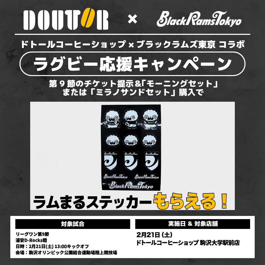 埼玉WK戦、浦安DR戦にて、ドトールコーヒーショップ駒沢大学駅前店のご協力のもと「ラグビー応援キャンペーン」実施しました。