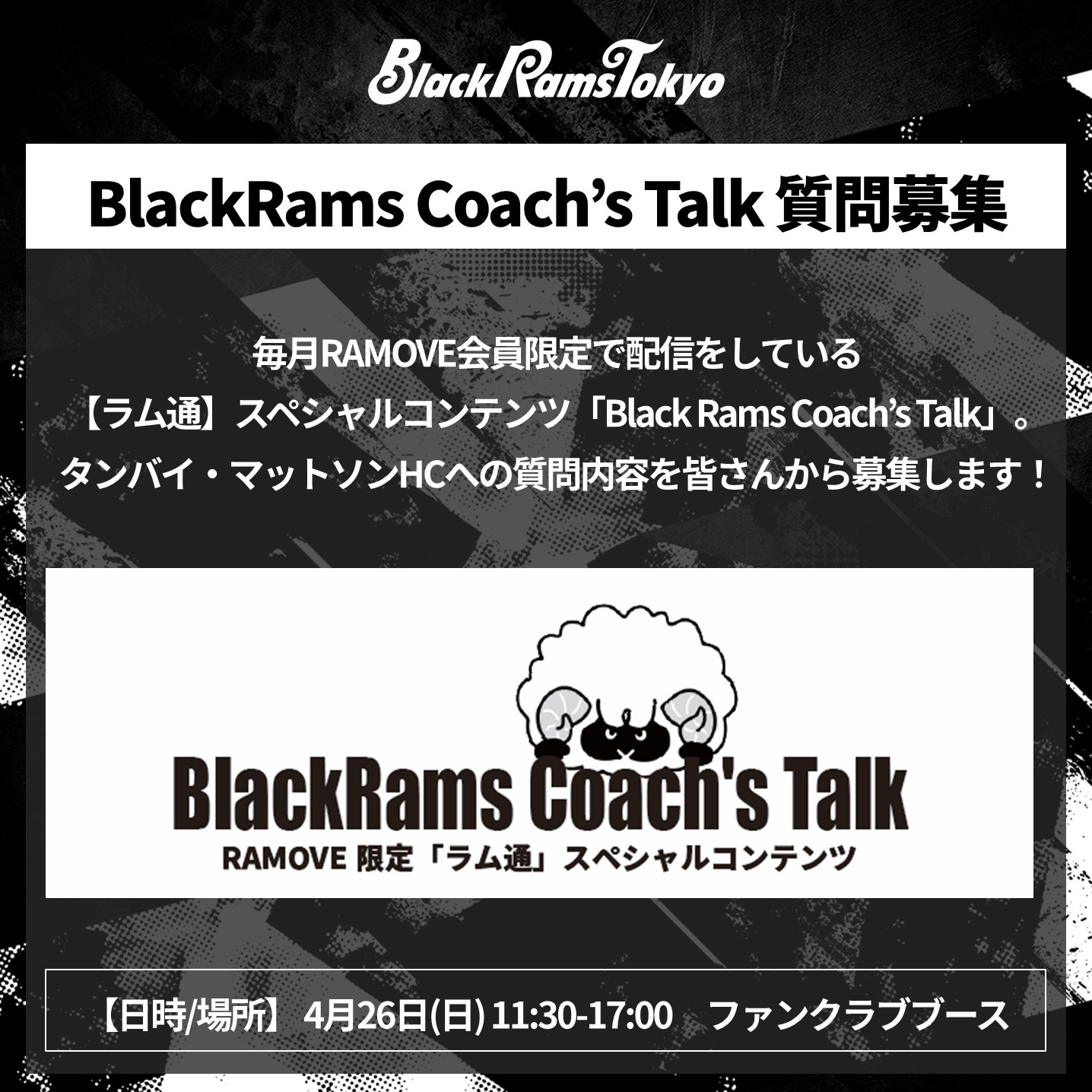 2026年4月26日(日) 第16節 トヨタヴェルブリッツ戦にて、RAMOVE会員限定で「BlackRams Coach’s Talk」質問募集企画を実施します。