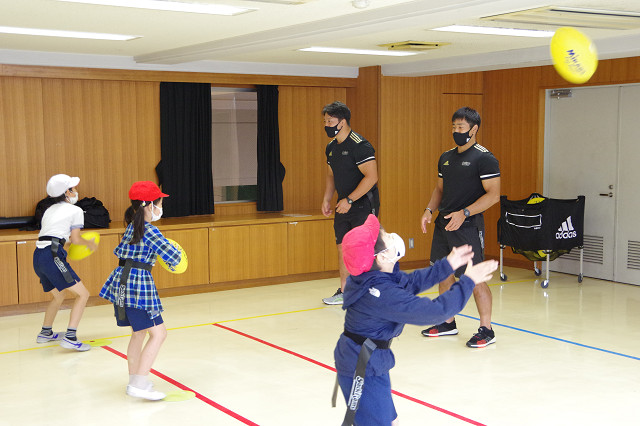 2020年度、最初のタグラグビー教室を実施しました。当日は、あいにくの雨でグラウンドが使えず、大会議室を使って行いました。スペースが狭い中、タグのつけ方、2人1組でのタグの取り合いや選手から投げられるボールを楽しそうにキャッチし、パスをする児童たちが印象的でした。また、来年1月に開催するトップリーグの試合を「絶対見に行きたい」と言ってくれる児童が多く、大変嬉しく感じました。