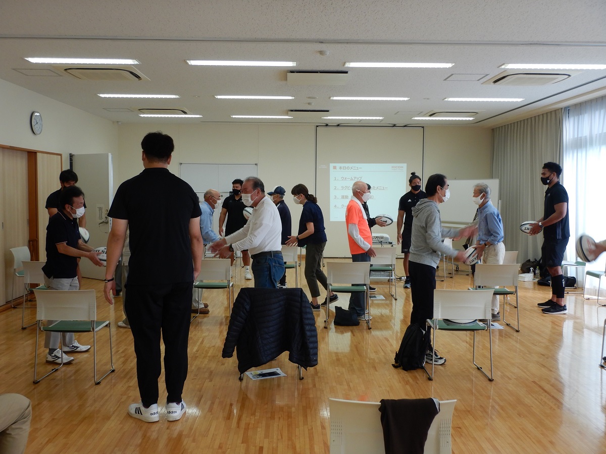 ラグビーボールを使った運動も途中で織り交ぜて行いましたが、ほとんどの方が初めてボールを触られたとの事で、楽しそうにボールを上に投げたり、パスされている姿がとても印象的で、沢山の質問などを頂き、あっという間の90分間でした。